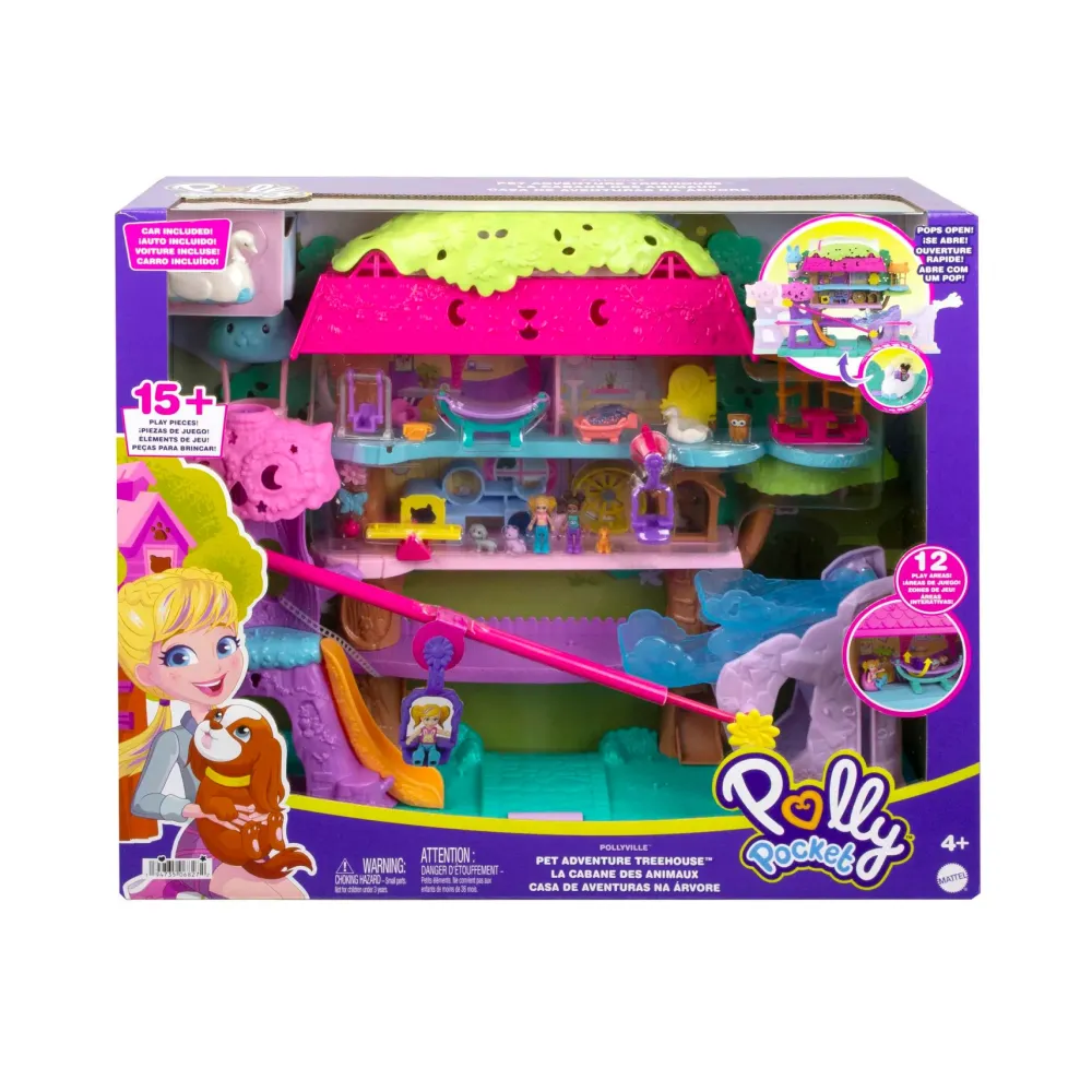 Il Playset Polly Pocket Pollyville Casa Sull’Albero Dei Cuccioli È Un Concentrato Di Divertimento E Attività Per I Cuccioli! Questo Playset È Il Top Delle Case Sugli Alberi! In Tutto Ha Cinque Piani Per Giocare E Puoi Espanderla In Modo Super Originale. Include Le Micro Bambole Polly E Shani, 4 Adorabili Animaletti, 9 Accessori Per Inventare Divertenti Feste Per I Cuccioli E 1 Veicolo A Forma Di Cigno. L’Azione Ha Inizio Non Appena Ti Metti Alla Guida Del Veicolo A Forma Di Cigno E Passi Sopra Il Dissuasore Di Velocità: In Questo Modo Farai Espandere Il Playset E Attiverai La Zipline; Continua A Guidare Passando Sopra Un Secondo Dissuasore E Rivela Uno Scivolo Con Cascata. I Bambini Possono Esplorare Le Sorprese E Gli Spazi Di Gioco Nascosti Suddivisi Su Cinque Piani E Accedere Ad Aree Come Lo Scivolo Di Emergenza Nascosto All’Interno Della Cuccia Per Cani, Il Punto Panoramico Sulla Cima Dell’Albero, L’Altalena Fatta A Cesta, Il Vano Segreto, L’Area Per Arrampicarsi, Quella Per Fare Un Giro In Mongolfiera E Molte Altre. Colori E Decorazioni Possono Variare. Un Regalo Fantastico Dai 4 Anni In Su.