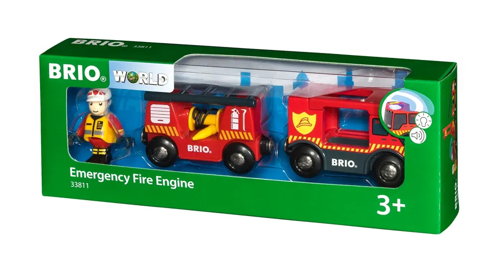 Camion Dei Pompieri Con Rimorchio Dotato Di Pompa Antincendio E Pompiere. Perfetto Per Completare Il Mondo Brio. Il Camion Emette Luci E Suoni. La Pompa Antincendio È Estraibile E Si Adatta Perfettamente Alle Mani Del Pompiere.