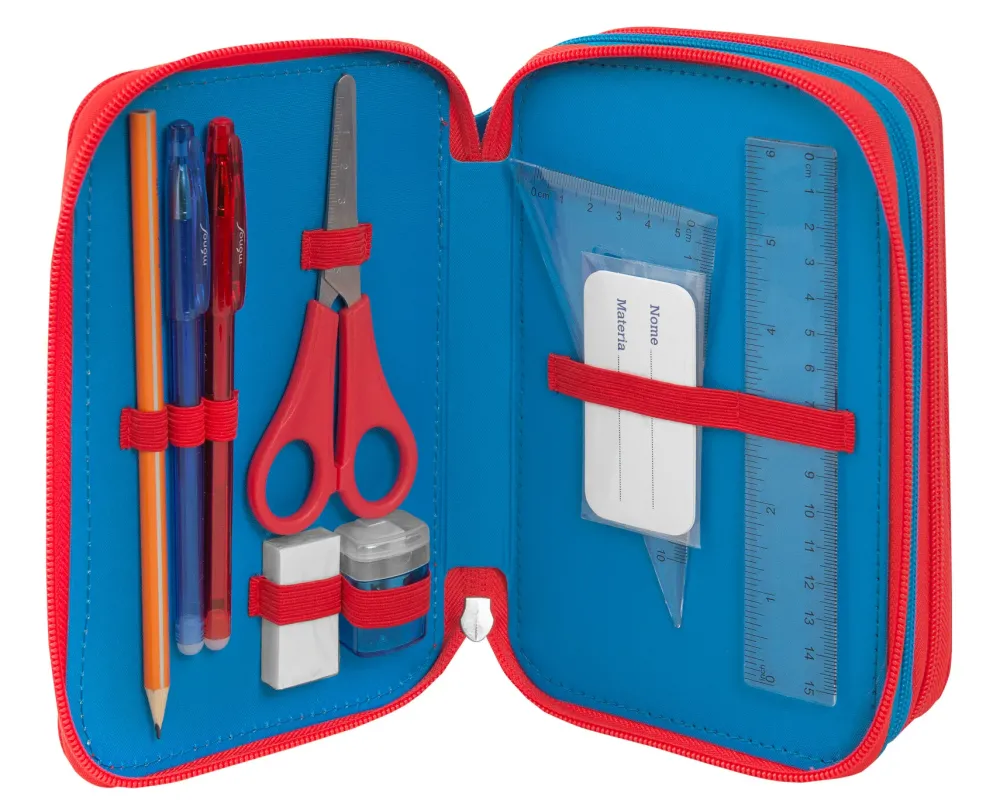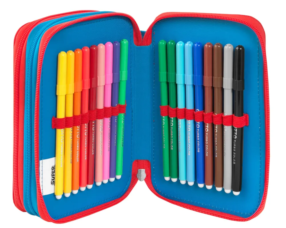 Astuccio Corredo 3Zip Supermario Contiene 18 Pennarelli, 18 Matite Colorate, Matita, Gomma, Penna Cancellabile Blu, Penna Rossa, Righetto, Temperino, Forbici Con Punta Arrotondata, Squadra.