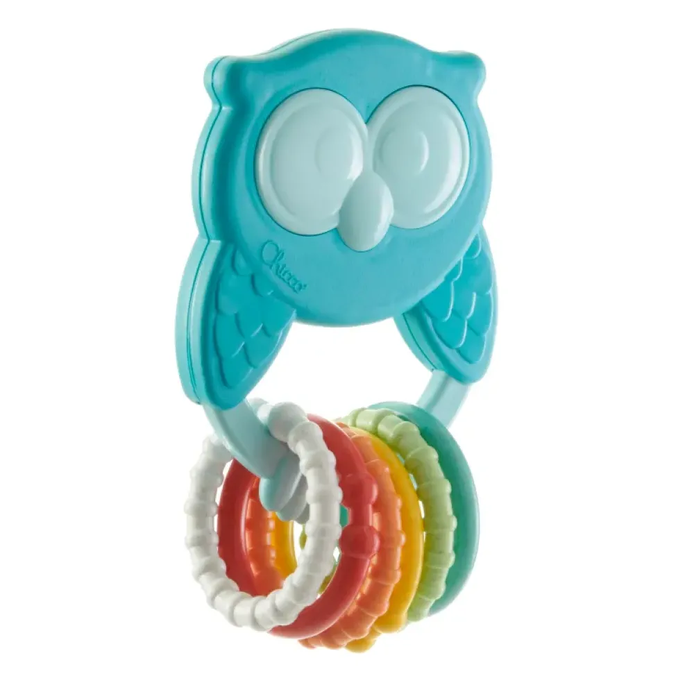 Simpatico Trillino A Forma Di Gufo Realizzato In Plastica Morbida Per Lenire Le Gengive E Dare Sollievo Durante Il Periodo Della Dentizione, Con Un Divertenete Effetto Sonaglio. I Diversi Colori E Le Differenti Texture Degli Anelli Stimolano Inoltre Le Capacità Visive E Tattili Del Bambino.