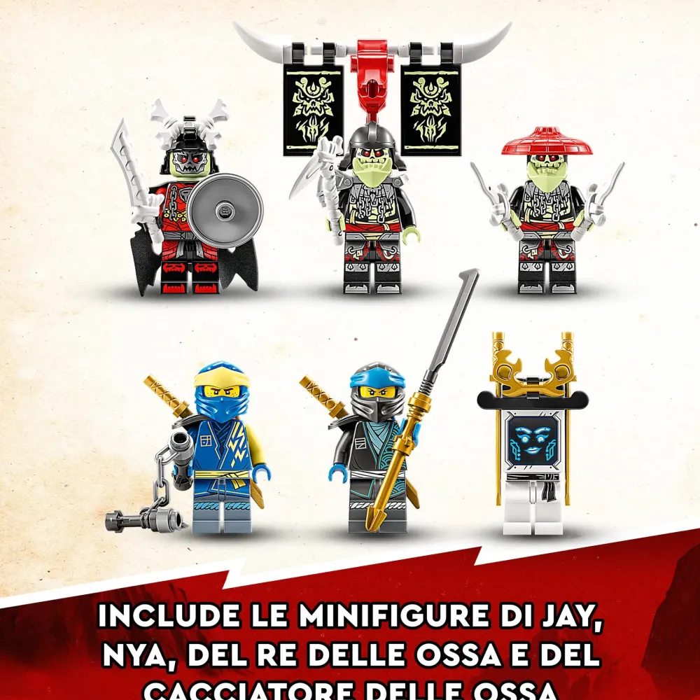 Il Mech Giocattolo Ha Mani, Braccia E Gambe Snodabili, Ed È Dotato Di Cabina Di Guida Per Jay, Una Grande Lama Di Drago, 2 Spade Katana E 2 Shooter Montati Sulle Spalle. Sono Compresi Nel Set 5 Minifigure Lego Ninjago: I Guerrieri Ninja Jay E Nya, Ciascuno Armato Di Spada Giocattolo, Il Re Dell’Osso, Il Cavaliere Dell’Osso E Il Cacciatore Dell’Osso, Pronti A Combattere Gli Eroi Ninja. Inoltre, È Incluso Un Piccolo Pixal Bot Con Clip Per Le Spade. I Guerrieri Scheletro Hanno In Dotazione Una Doppia Balestra A Fuoco Rapido, Caricata Con 4 Dardi E Montata Su Un Carro; Tutto L’Occorrente Per La Battaglia E Per Inventare Tanti Giochi Creativi.