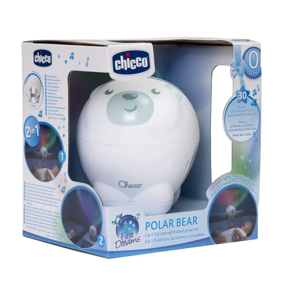 Orso Polare Azzurro Della Linea First Dreams Di Chicco È Un Proiettore Con Effetti Luminosi E Melodie, Ideale Per Creare Un’Atmosfera Rilassante Per Il Riposo Del Bambino. Può Essere Utilizzato Sia Come Proiettore Da Agganciare Alla Culla Che Come Proiettore Da Appoggiare Sul Comodino. Può Proiettare L’Aurora Boreale Per 30 Minuti Insieme A Musica Classica E Suoni Della Natura. Ha Due Pulsanti, Uno Per Selezionare Le Melodie E Uno Per Attivare O Disattivare La Proiezione.
