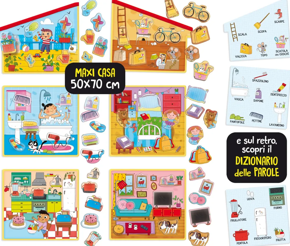 Una Casa Gigante Con Tante Cose Da Mettere Nel Posto Giusto. E Sul Retro Scopri Tante Paroline E Impara A Leggere! Un Gioco Che Prevede Un’Attività Di Classificazione E Manipolazione Tattile, In Linea Con Il Metodo Montessori.
