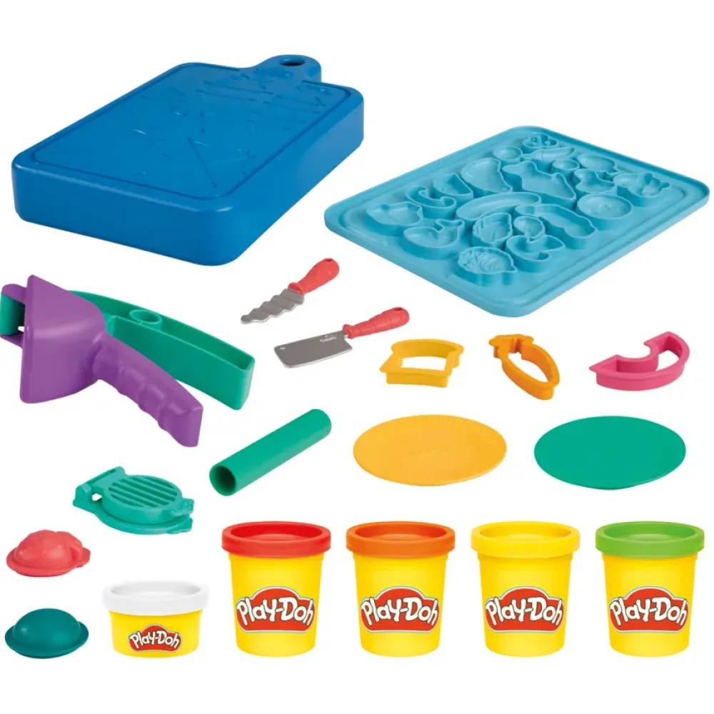 Comincia A Preparare! Il Mio Primo Set Da Chef Di Play-Dohè Dedicato Agli Aspiranti Cuochi E Include 14 Accessori Da Cucina Finti E 5 Colori Play-Doh. I Bambini E Le Bambine Possono Creare Forme Di Cibo Finto Usando Gli Stampini E I Tagliapasta E Poi Seguire Le Linee Guida Presenti Sul Tagliere Finto Per Affettare E Tagliare Con I Coltelli Giocattolo! Si Divertiranno Un Mondo A Usare Gli Strumenti Per Attività Manuali Come Lo Schiaccia Aglio, Il Tagliauova E Gli Stampi Presenti Nella Parte Inferiore Del Coperchio Del Tagliere Per Creare Buffe Forme Di Cibi Play-Doh. Questo Playset Da Cucina Include Persino Piatti Finti, Così Bambini E Bambine Possono Presentare Con Orgoglio Le Proprie Creazioni. Che Sia Il Primo Set Play-Doh O Un Regalo Per Bambini E Bambine Dai 3 Anni In Su, Fai Scoprire Loro Il Divertimento Offerto Dai Giocattoli Play-Doh! Hasbro, Play-Doh E Tutte Le Proprietà Correlate Sono Marchi Commerciali Di Hasbro.