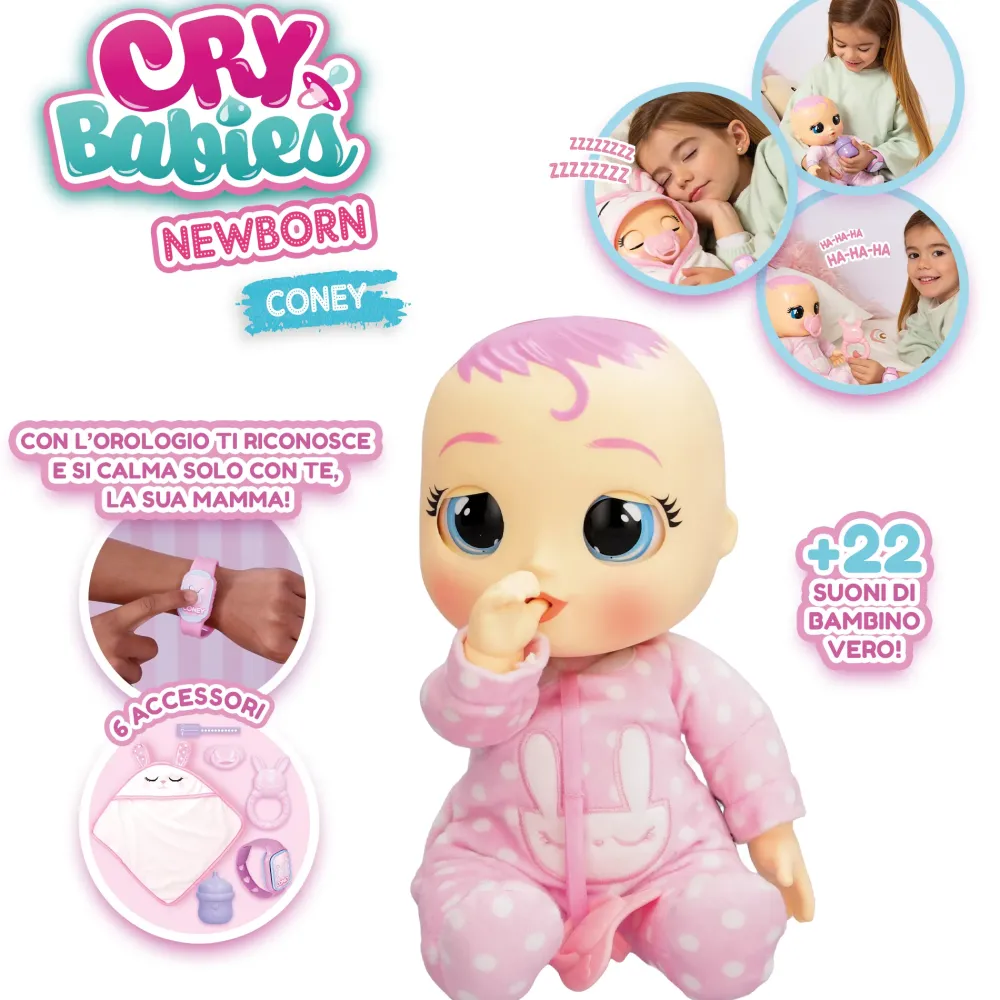 Diventa La Migliore Mamma O Papà Con La Nuova Newborn Coney Di Cry Babies! Come Una Vera Neonata, Coney È Piccola, Tenera E Morbidissima Ed È Alta 30Cm. Prenditi Cura Di Lei Come Fosse Latua Vera Bambina! Coney Emette Suoni Realistici Di Bebè. Si Addormenta Quando La Sdrai, Chiudendo Lentamente Gli Occhi E Li Apre Al Tirarla Su. Puoi Far Finta Di Allattarla Dandole Il Biberon! Inoltre, Come Tutti I Cry Babies, Piange Lacrime Vere E Smette Di Piangere Con Il Ciuccio. Ma Per Farla Calmare Davvero Devi Prenderla Tra Le Tue Braccia, Dopo Aver Indossato Il Braccialetto Affinchè Ti Riconosca Come La Sua Mamma… Così Solo Con Te Si Sentirà Sicura E A Suo Agio Per Riaddormentarsi! Inoltre, Adora Giocare Con Il Suo Sonaglio Preferito! Viene Fornita Con 6 Accessori: Ciuccio, Biberon, Coperta Personalizzata, Sonaglio, Braccialetto Di Nascita Ebraccialetto Elettronico Da Indossare Per La Bambina. Età Consigliata +18 Mesi.