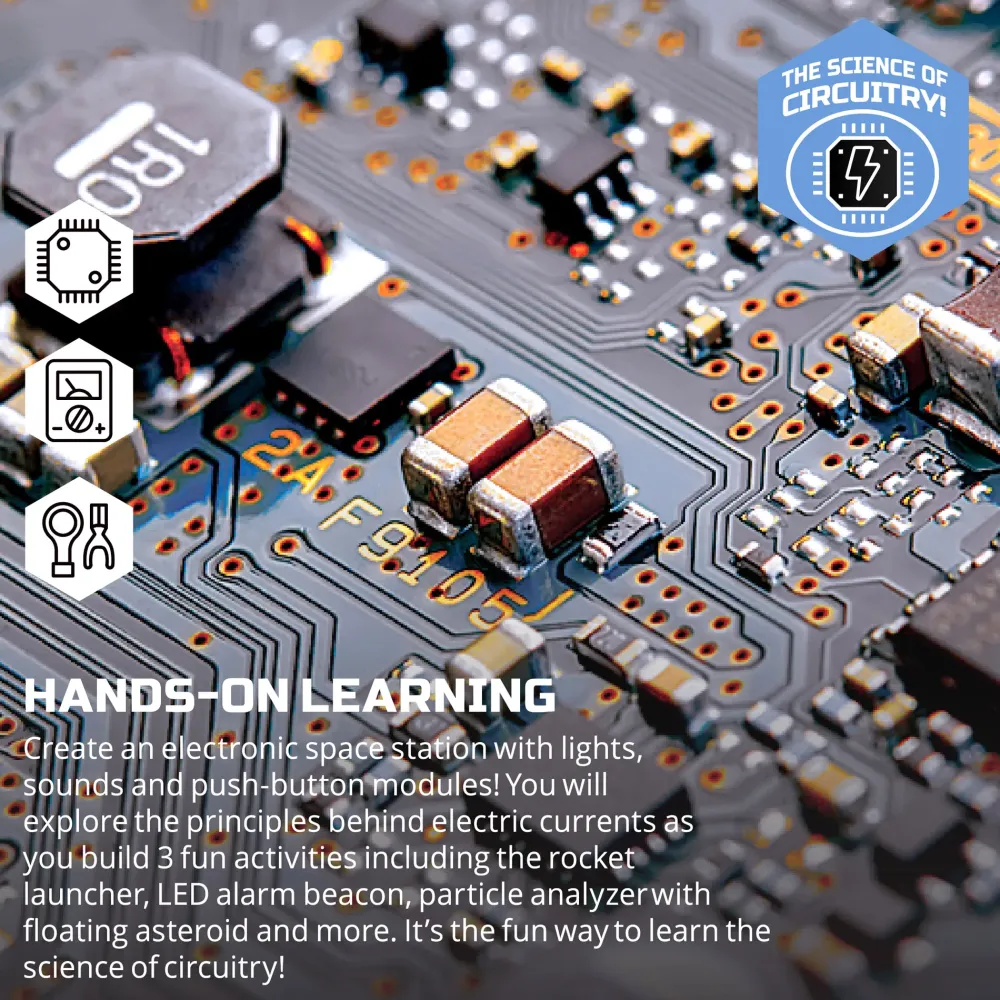 Il Set Di Esperimenti Circuitry Della Stazione Spaziale Di Discovery Mindblown Ti Consente Di Creare I Tuoi Esperimenti Alimentati Con Elettricità Reale! Realizza Progetti Di Circuiti Divertenti Con 3 Moduli A Pulsante, Inclusi Un Razzo Lanciatore, Un Analizzatore Di Particelle E Un’Antenna Rotante. Conduci Esperimenti Unici Che Insegnano I Principi E Le Sfumature Dell’Ingegneria Elettrica E Del Design Dei Circuiti.