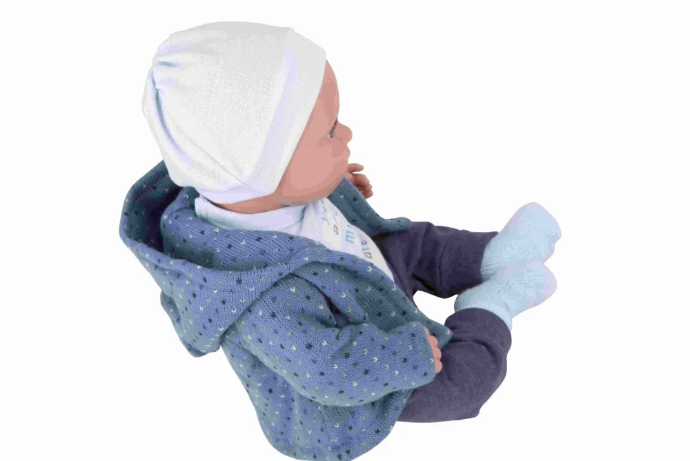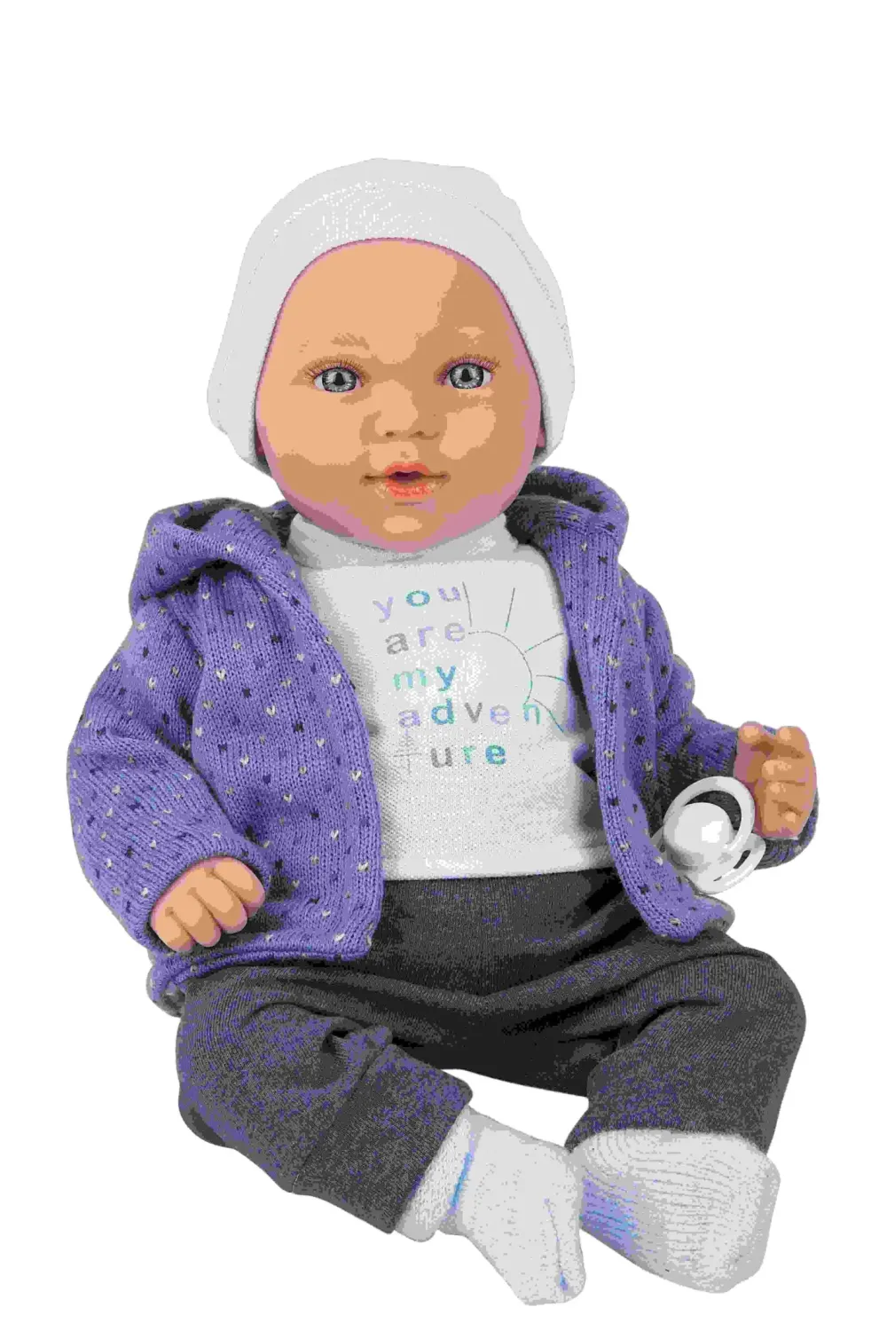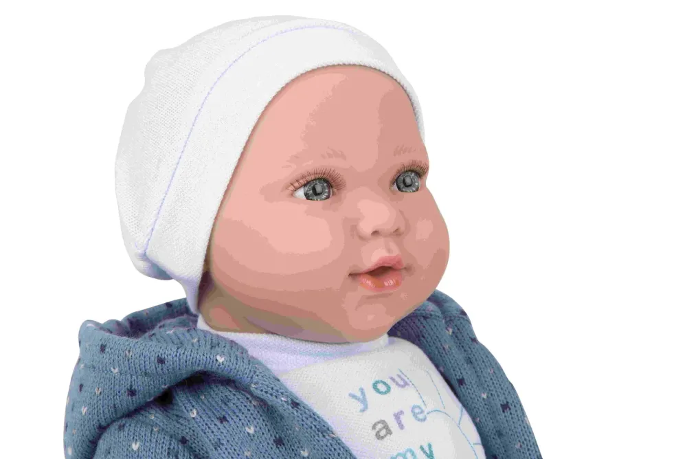 Bellissima Bambola Con Funzione Piangenterealizzata In Morbido Vinile, Con Dettagli Realistici E Delicato Profumo Di Vaniglia. Indossa Un Bel Completino Composto Da Pantalone Jeans, Maglietta Con Stampa Azzurra, Giacchino In Tricot Blu,Cappellino E Calzine Abbinati. Favorisce Il Gioco Di Imitazione.