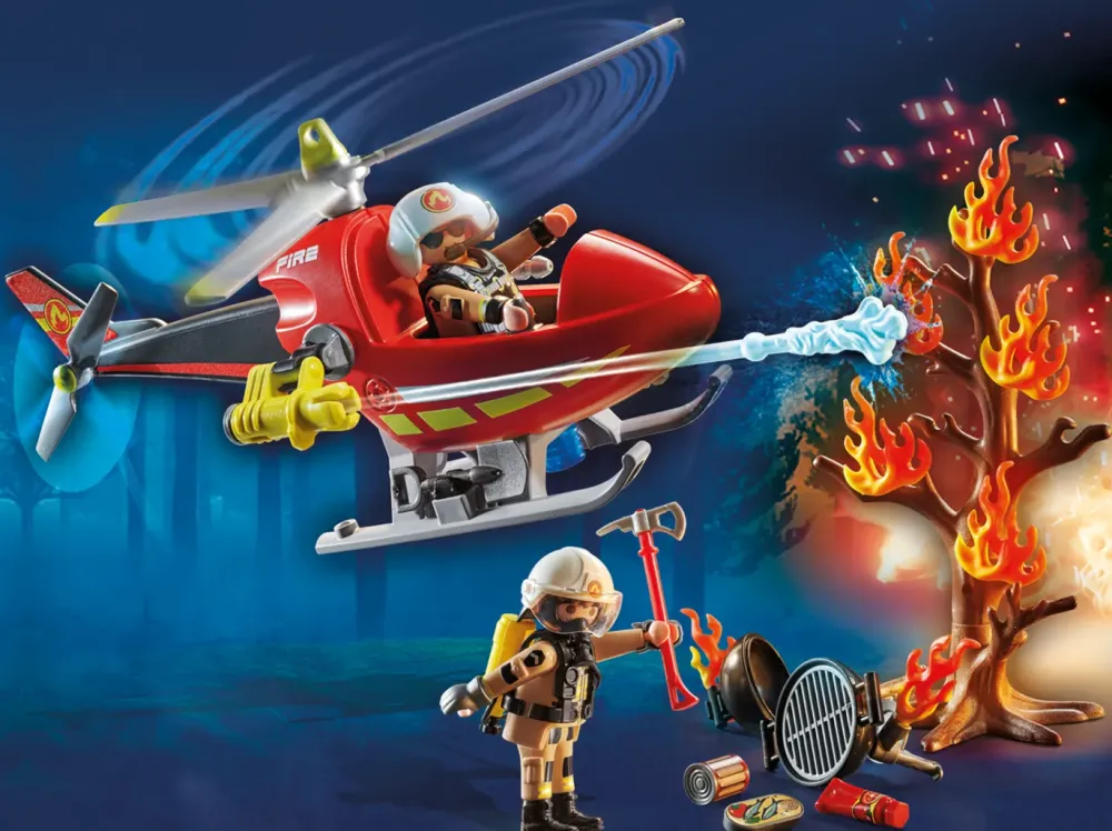 Missione Per I Pompieri Playmobil: Moderno Elicottero Playmobil Con Cannone Estintore, 1 Vigile Del Fuoco Playmobil Con Imbracatura E 1 Pilota Playmobil. Le Frecce A Getto D’Acqua Possono Essere Lanciate Dal Cannone Antincendio Sul Lato Dell’Elicottero. L’Elicottero Antincendio Può Essere Combinato Con La Caserma Dei Pompieri