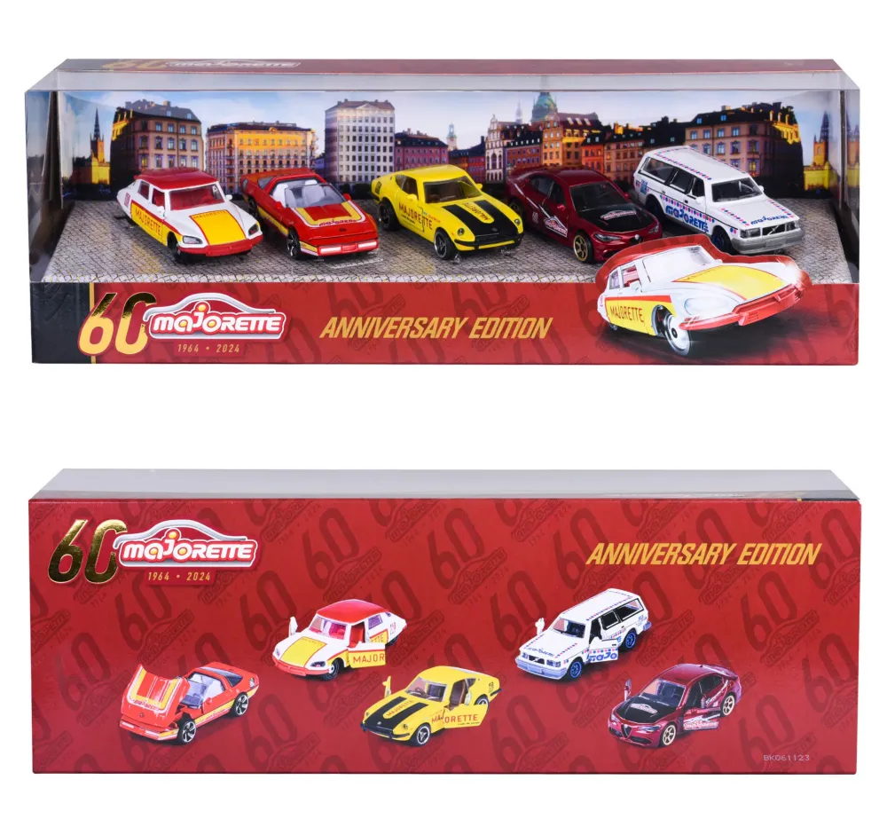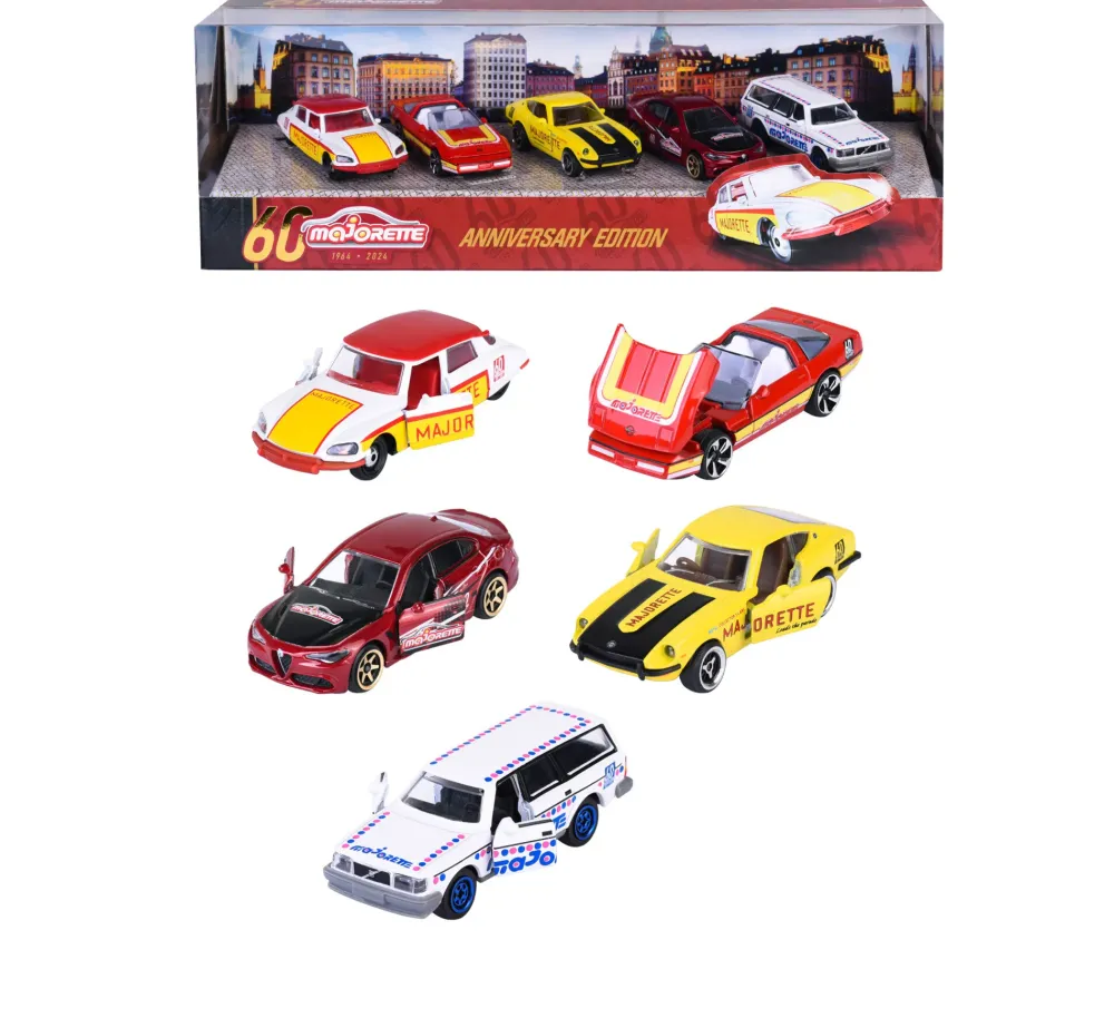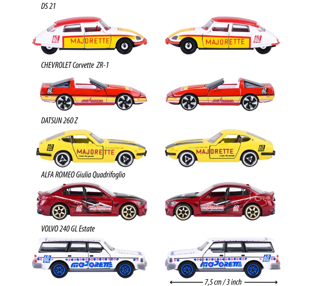 Edizione Anniversario Majorette: Festeggia Il 60° Compleanno Dei Modellini Majorette Con 5 Auto Iconiche Di 60 Anni Di Storia Automobilistica, Inclusi 2 Modelli Esclusivi! 1. Ds 21, 2. Datsun 260 Z, 3. Volvo 240 Gl, 4. Chevrolet Corvette 1990 Zr-1, 5. Alfa Romeo Giulia. La Datsun 260 Z E La Ds 21 Sono Disponibili Solo In Questo Set.