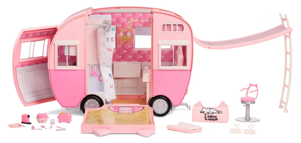 Outlet Na Na Na Surprise Kitty-Cat-Camper Rosa Con Orecchie E Coda Da Gatto 7 Aree Di Giochi Tra Cui Cucina Completa, Amaca E Accessori Fashion Dolls