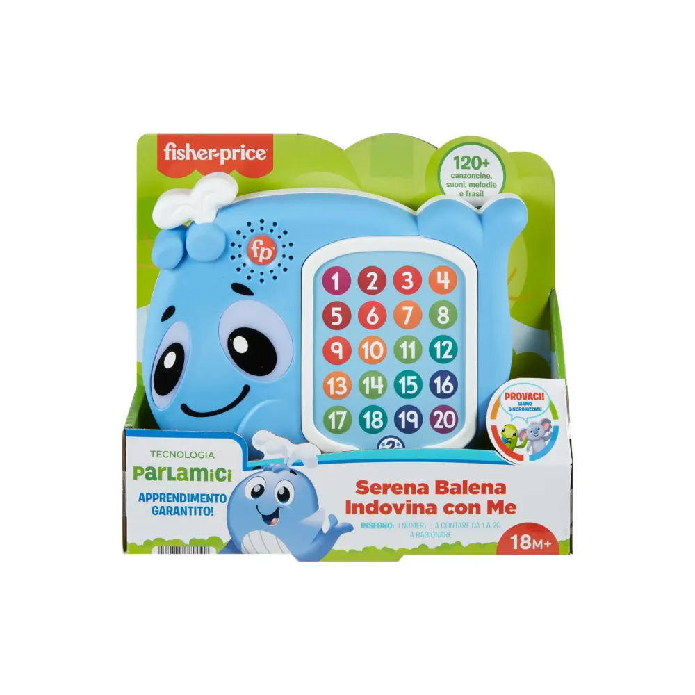 I Bambini Ai Primi Passi Si Divertiranno Un Mondo A Giocare Con Serena Balena Indovina Con Me Parlamici Da Fisher-Price. Questo Giocattolo Musicale Interattivo Ed Educativo È Dotato Di 20 Tasti Numerati Da Premere Per Vedere Gli Occhi Della Loro Amica Illuminarsi, Mentre Oltre 120 Canzoni, Suoni E Frasi Insegnano I Numeri Da 1 A 20. Per Un Divertimento Su Misura Per I Bambini, Basta Premere Il Tasto Quiz Per Scoprire Entusiasmanti Giochi Educativi Con La Balena. Quando Avvicini Serena Balena Indovina Con Me Ad Altri Parlamici, Si Illuminano, Parlano, Cantano E Suonano Insieme! Giocattoli Aggiuntivi In Vendita Separatamente, Secondo Disponibilità.
