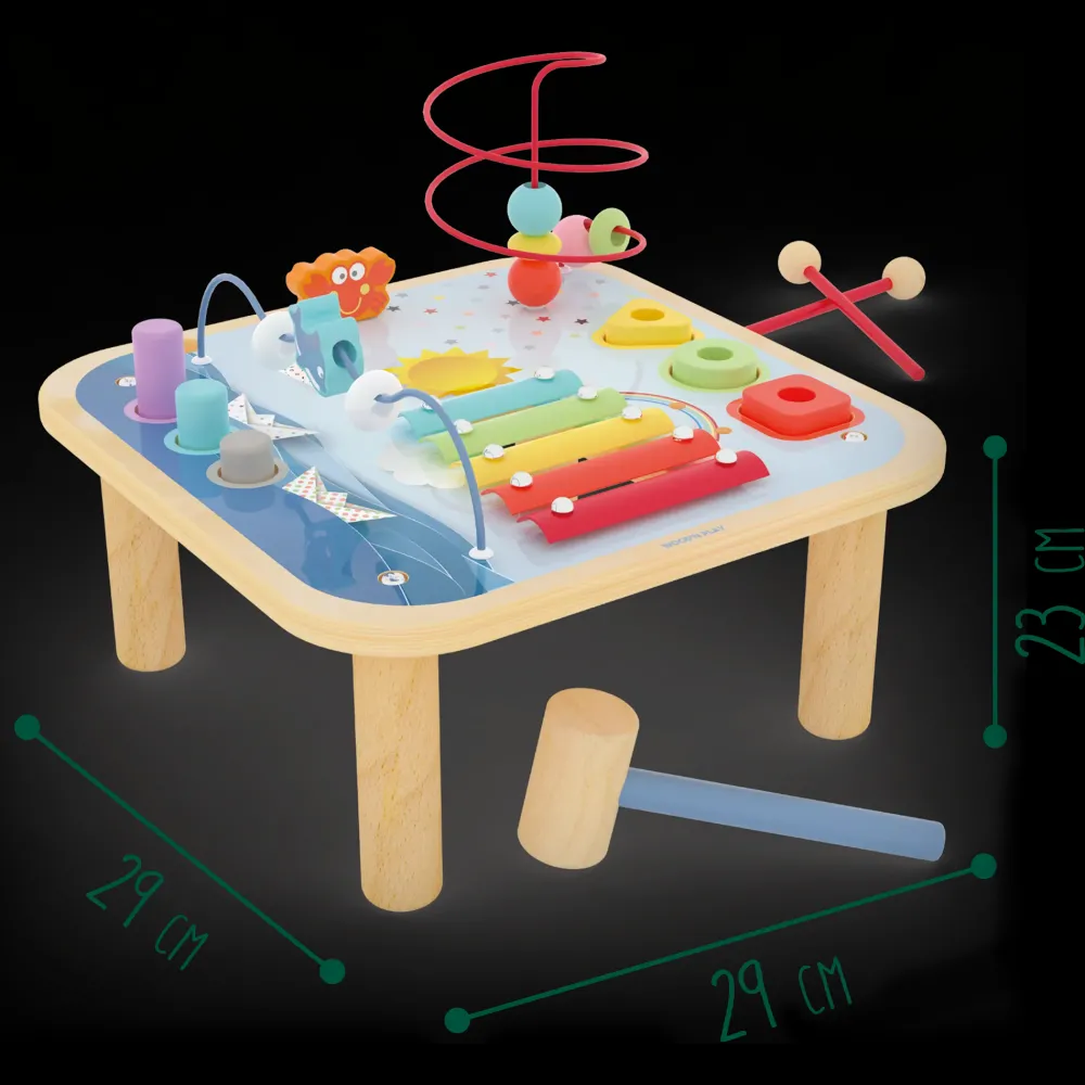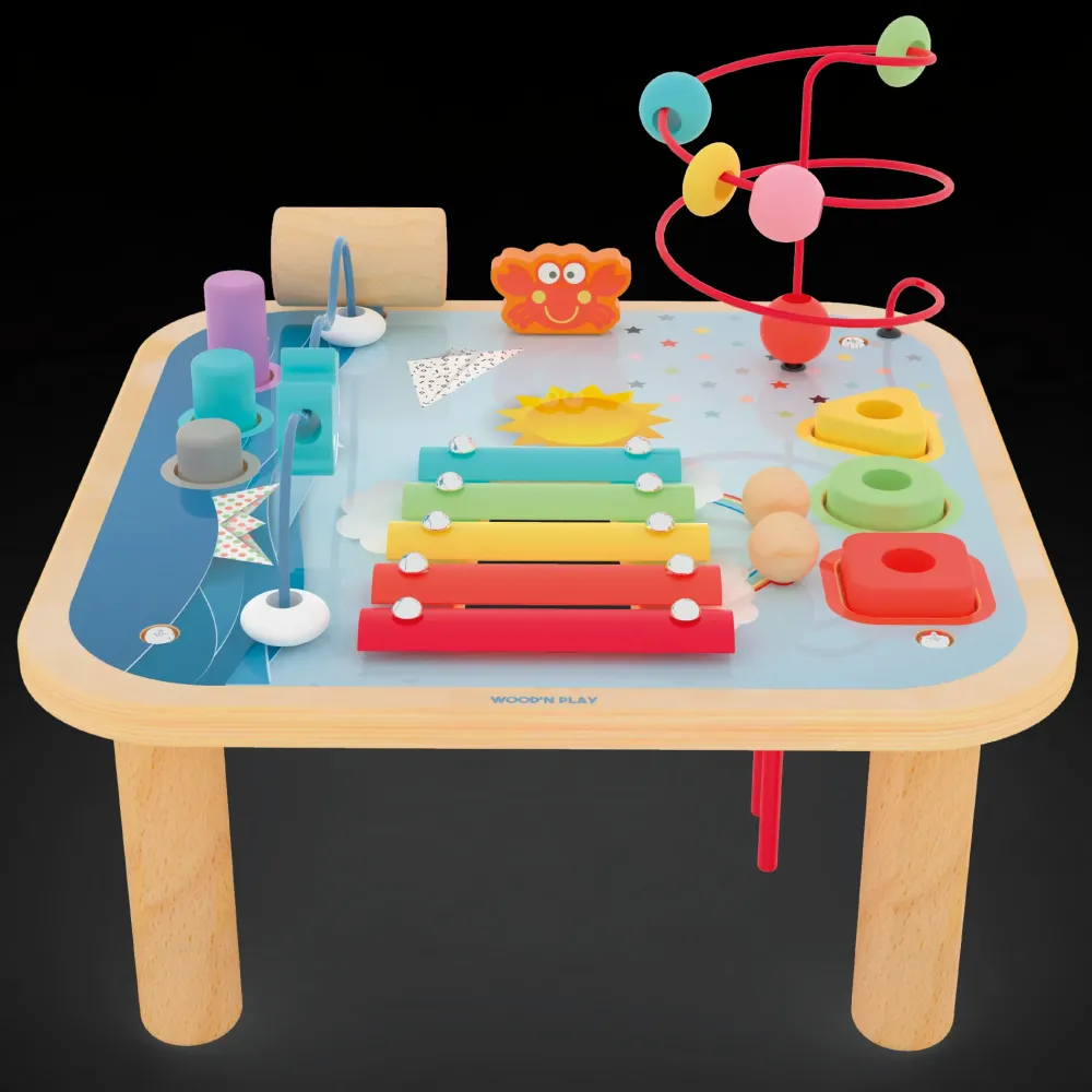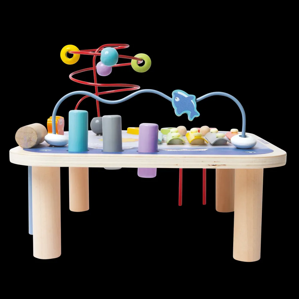 In Un Solo Gioco Tante Attività Stimolanti. Tavolino Gioco Ricco Di Colori Ideale Per Intrattenere A Lungo I Più Piccoli: -Gioco Delle Forme Da Inserire Nelle Fessure Corrispondenti Per Imparare A Riconoscere Forme E Colori; -Labirinto Con 5 Perle Da Far Scorrere Lungo Il Filo In Metallo Per Imparare Il Concetto Di Spazio Tridimensionale; -Xilofono Con 5 Piastre In Metallo Per 5 Toni Differenti, Per Sviluppare Il Senso Della Musica. I Colori Vivaci Lo Rendono Davvero Accattivante! -Gioco Del Batti Batti Perfetto Per La Coordinazione Occhio-Mano. -Tema Marino, Con Barchette, Granchietto, Percorso A Onda Per Divertirsi A Far Nuotare Un Delfino .