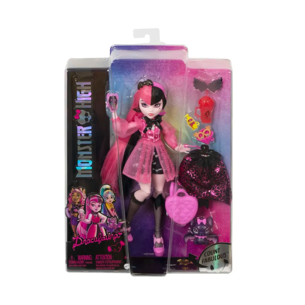 Le Mostramiche Di Monster High Tornano A Scuola Con Look All’Ultimo Grido! La Bambola Draculaura Conquista I Corridoi Della Monster High Con Un Outfit Da Urlo, Che Include Shorts Con Cuoricini E Una Camicetta Vampiresca In Stile Corsetto Con Maniche Trasparenti. Il Suo Look Da Paura È Completo Di Calze Velate Con Volant, Scarpe Rosa Con Plateau, Cerchietto E Occhiali Da Sole Con Dettagli Ispirati Ai Pipistrelli. Porta Il Look Della Bambola Draculaura A Un Livello Superiore Con Mantello E Accessori Spaventosamente Chic. Vivi Avventure Da Brivido Con Il Conte Fabulous, Il Suo Cucciolo Di Pipistrello Spettralmente Simpatico! La Bambola Non Può Reggersi In Piedi Da Sola. Colori E Decorazioni Possono Variare.