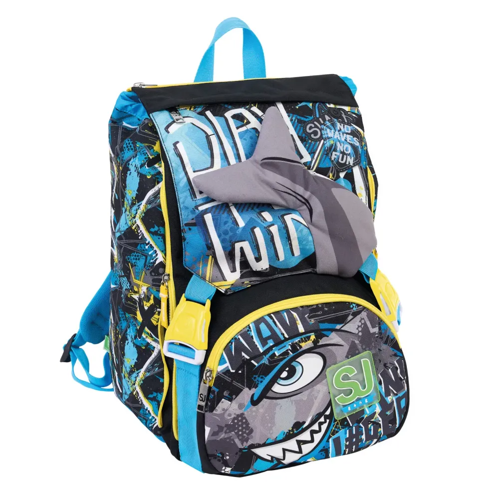 Zaino Doppio Scomparto Estensibile Tramite Zip Laterali, Coda Squalo 3D Con Shaking System. Tasto On/Off Per Attivare Il Dispositivo Di Movimento Della Coda Sulla Pattina. Fantasia Allover E Stampa Posizionata.