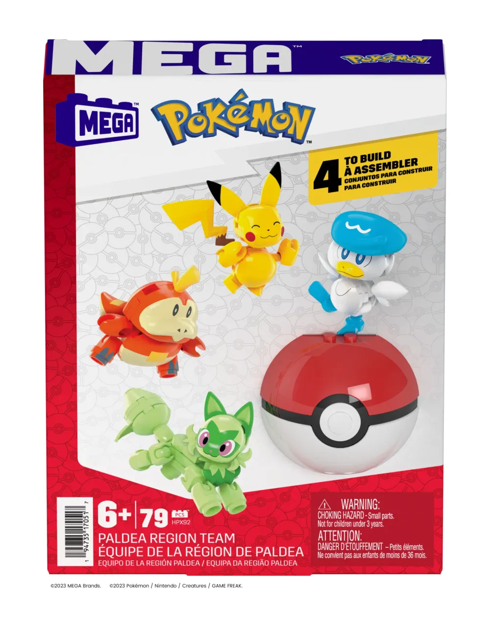 Allenatori Pokémon, Benvenuti A Paldea. Questo Set Include 4 Personaggi Snodati Da Costruire, Tra Cui Pikachu E I 3 Primi Nuovi Pokémon Della Regione: Sprigatito, Fuecoco E Quaxly. Include Anche Una Poké Ball Con La Parte Superiore Dentellata Per Maggiori Possibilità Di Esposizione. Abbinalo Ad Altri Set Da Costruzione Mega Pokémon, Ognuno In Vendita Separatamente.