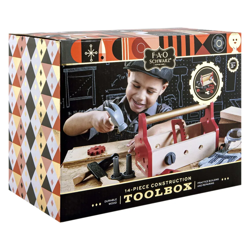 Cassetta Degli Attrezzi Di Fao Schwarz In Legno Con 14 Pezzi: Il Set Include Martello, Cacciavite, Chiave Inglese, Tavola, Tavola Seghettata, 2 Viti, 2 Chiodi, 2 Dadi, 2 Ingranaggi E Una Scatola Degli Attrezzi