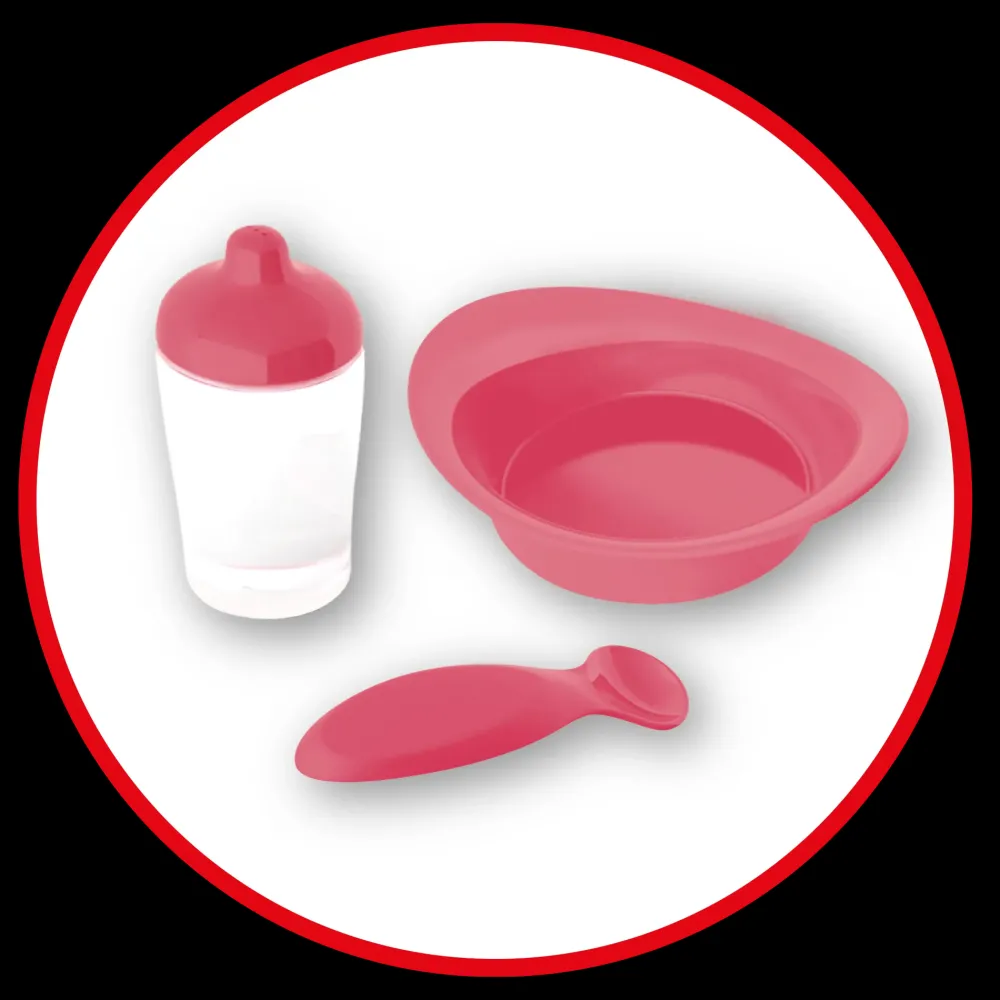 – La Confezione Include 3 Accessori Per La Pappa: Un Biberon, Un Piattino Ed Un Cucchiaino.