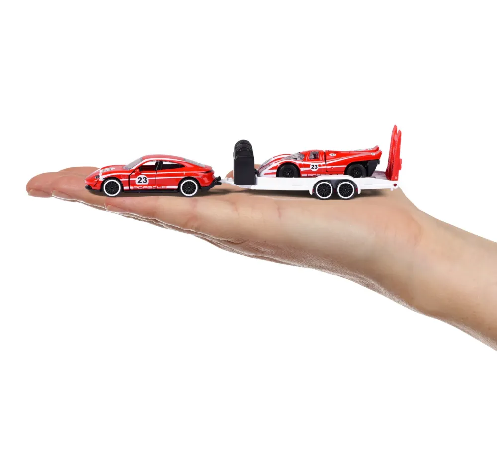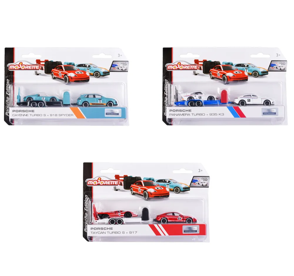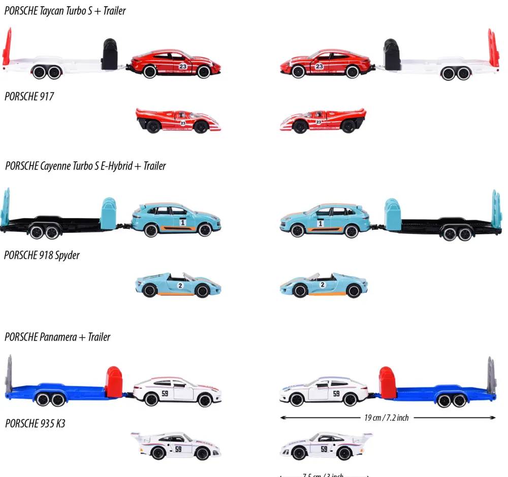 Majorette- Porsche Race Trailer Set, Auto Con Rimorchio. Tre Diversi Modelli Tra Cui Scegliere: 1. Porsche Cayenne Turbo S E-Hybrid Con Porsche 918 Spyder, 2. Porsche Panamera Con Porsche 935 K3, 3. Porsche Taycan Turbo S Con Porsche 917. Il Rimorchio Può Essere Agganciato Al Veicolo Trainante E La Rampa Di Carico Può Essere Ripiegata In Modo Che L’Auto Da Corsa Possa Salire Facilmente.