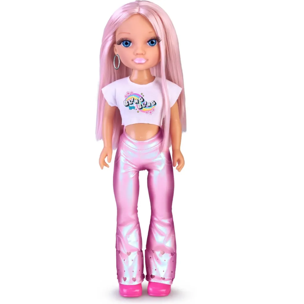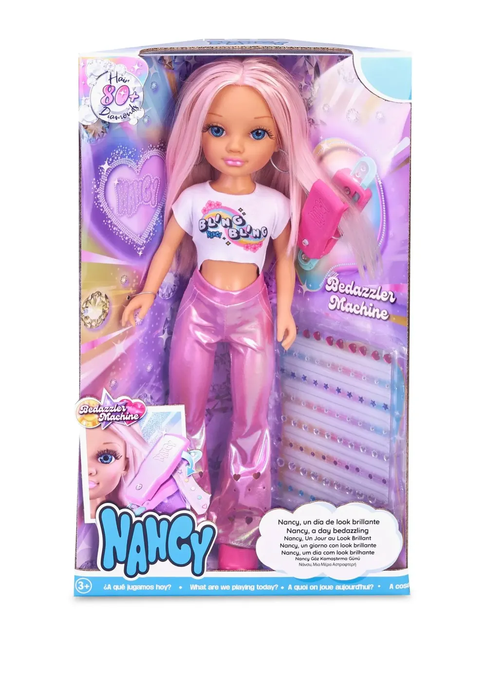 Con Nancy Un Giorno Con Look Brillante, Sarà Possibile Decorare I Suoi Lunghi Capelli Rosa Creando Infiniti Disegni Grazie All’Accessorio Incluso. Include Più Di 80 Gemme Di Diverse Forme E Colori. Indossa Pantaloni Color Rosa Metallico, Una Maglietta Bianca Con Arcobaleno E Scarpe Rosa Abbinate Il Balsamo Sulle Labbra Si Abbina Ai Suoi Capelli Rosa.